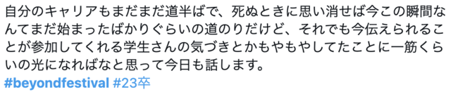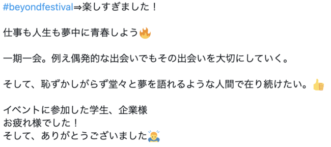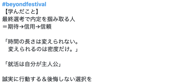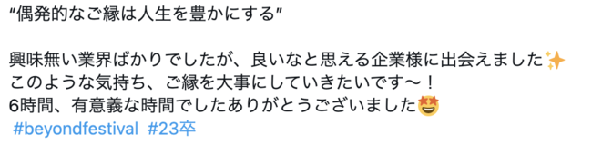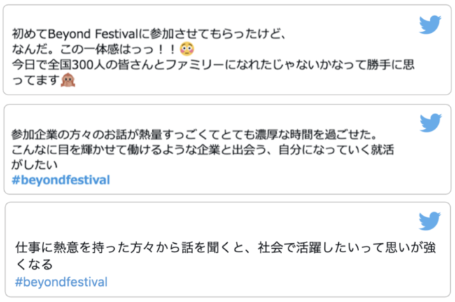Twitterでは、「#beyondfestival」をつけて参加企業や学生が当日学んだことを発信しています。1回の開催につき、投稿数は約400件に上ります。学生はSNS上で就活仲間と繋がることができ、企業は自社の採用ブランディング強化に繋げることもできます。