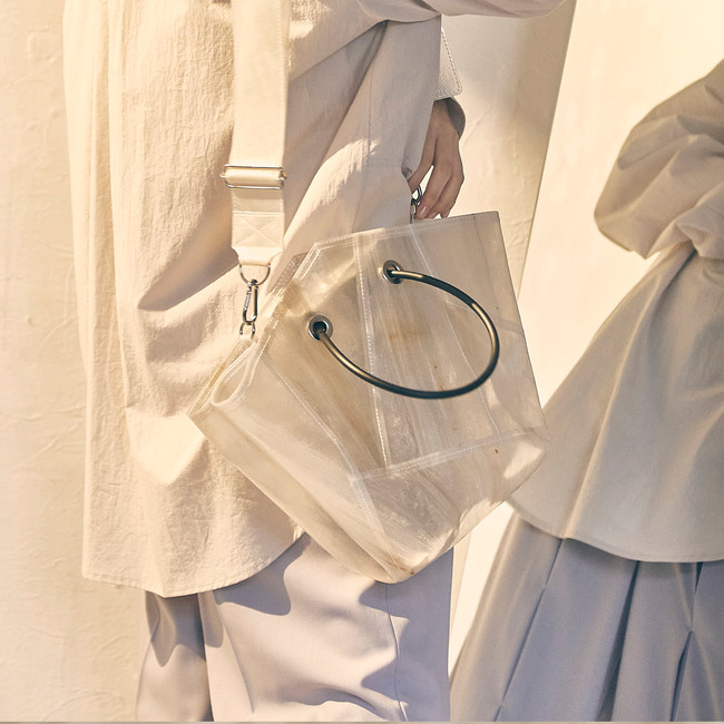 今制作にあたり、使用された過去を物語る「サビ」たビニール傘を、あえて素材としてピックアップ。それぞれの個性を感じさせる一点ものの「サビ」が模様となったバッグは、従来のアップサイクルのクリーンなイメージから離れ、「サビ」を個性として残すことで、傘のユーザーを新たなオーナーへと繋ぎ、物の価値を再定義するバッグへと生まれ変わっています。