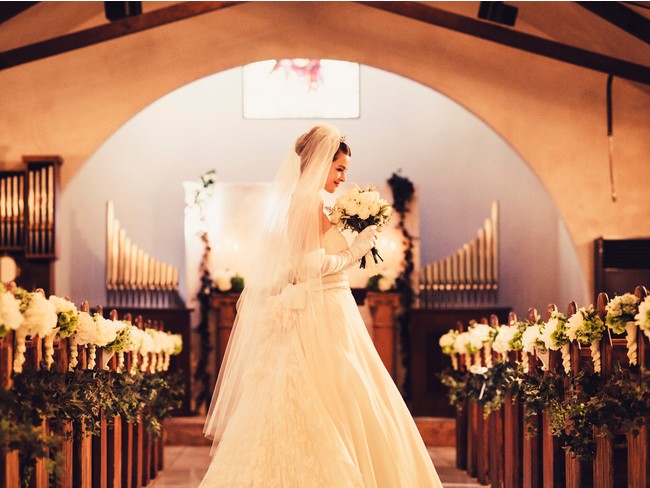 ロックハート城内、中庭大広場に佇む歴史ある小さな教会、セントローレンス教会で、ウエディング専属ショップ協力によるドレス&タキシードを纏ってフォト体験はいかがでしょうか。