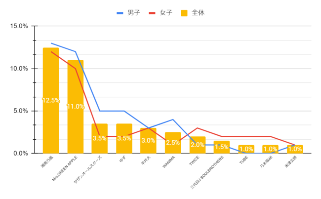 アンケートで、男女共に人気が最も高かった楽曲は、Mrs. GREEN APPLEの「青と夏」でした。コメントなどから、体育祭や合唱祭などの学校行事で使用されている楽曲が上位にランクインしているようでした。