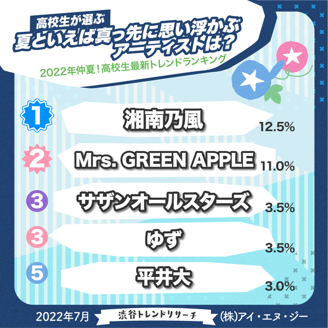 2位のMrs.GREEN APPLEは、「爽やかな歌声の青と夏が印象的だから」(高2・女子)「楽しく盛り上がるような夏にぴったりのバンドだから」(高3・男子)などのコメントが多数寄せられていました。