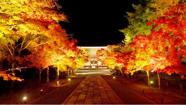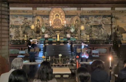 鮮やかに照らされた紅葉に囲まれて、京都御所から移築した現存最古の紫宸殿とされる金堂において、京都フィルハーモニー室内合奏団によるチェロとバイオリンの音楽奉納を執り行います。仏様に向き合い“祈りの音色“に耳を傾けてはいかがですか。数々の仏像や重要文化財が安置された夜の霊宝館にもご入場いただけます。