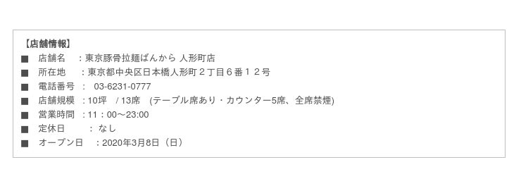 株式会社花研(本社:東京都豊島区、代表取締役社長:草野直樹)は、「東京豚骨拉麺ばんから 人形町店」を3月8日(日)、中央区日本橋人形町にオープンいたします。 「東京豚骨拉麺ばんから」としての出店は41店目となります。