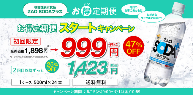 株式会社ライフドリンク カンパニー(本社:大阪府大阪市、代表取締役社長:岡野 邦昭)(以下「当社」)は、当社直営店舗「LIFEDRINKオンラインストア 本店」の定期購入サービス「お得定期便」第2弾となる、機能性表示食品『ZAO SODAプラス(プレーン)』コースを2023年6月15日より開始いたします。