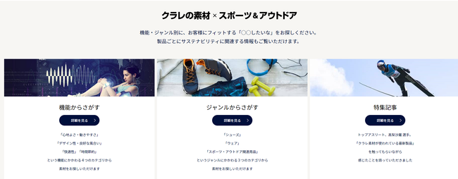 展示会では、「機能(心地よさ/デザイン性/快適性)」又は「ジャンル(シューズ/ウェア/スポーツ・アウトドア関連用品)」のコーナーから、お客様が求める素材や製品を探すことができます。加えて、関心の高いサステナブル関連のトピックスを製品ごとに掲載。特集記事では、スキージャンプのトップ選手として活躍する当社社員・高梨沙羅選手のインタビュー記事を掲載するとともに、スポーツに貢献するユニークな素材と技術を紹介します。