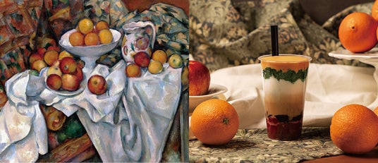 左:ポール・セザンヌ《リンゴとオレンジ》右:オレンジクリームと角切りりんごのミントミルクティー