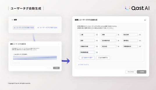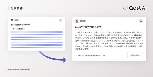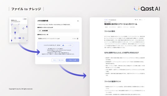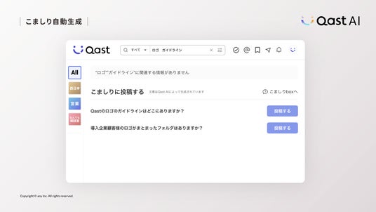 any株式会社(所在地:東京都千代田区、代表取締役:吉田和史、以下:any)は、ナレッジプラットフォーム「Qast(読み方:キャスト)」にAI機能を実装し、企業のナレッジマネジメントの自動化・効率化をサポートする「Qast AI」をリリースしたことをお知らせいたします。このAI機能の実装により、従来手動で行われていた作業をAIが効果的に補完することが可能となり業務効率の向上が見込めます。