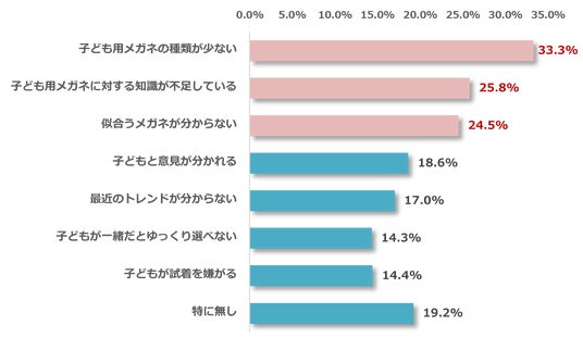 子どものメガネデビュー時に、メガネ選びで困ったことがあったか質問したところ、最多回答は「子ども用メガネの種類が少ない(33.3%)」、次に「子ども用メガネに対する知識が不足している(25.8%)」、「似合うメガネが分からない(24.5%)」と続きました。