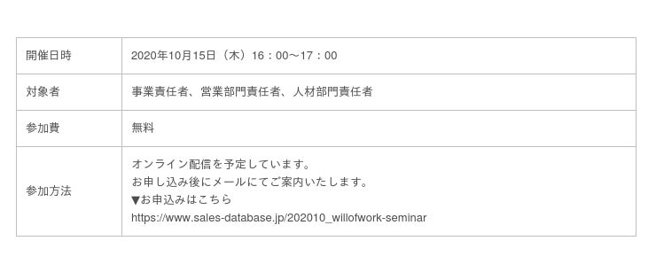 人材サービスを主力とする株式会社ウィルオブ・ワーク(本社:東京都新宿区、代表取締役社長 告野 崇)は、ギグセールス株式会社(本社:東京都港区、代表取締役 CEO 小林 竜大)と共催で、オンラインセミナー「toB新規開拓に欠かせないアウトバウンド営業のチャネル構築」を 2020年10月15日(木)に開催します。