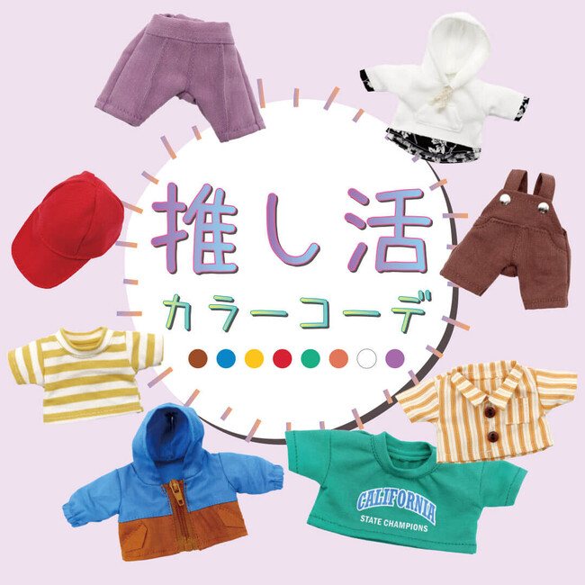 8色のカラーを取り入れたカラフルなデザインのコスチューム。好きなアイドルのテーマカラーをテディベアやお気に入りのぬいぐるみに着せて「推し活」を楽しめます。