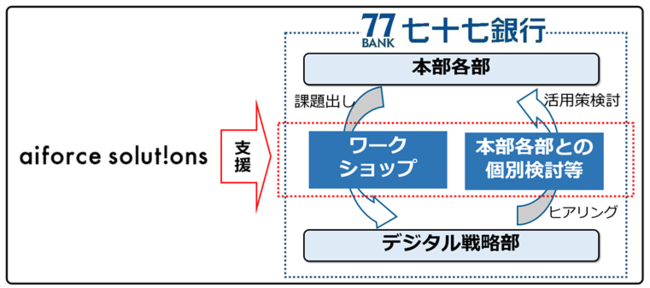 七十七銀行におけるAI活用領域のさらなる拡大およびデータ利活用分野の人材育成を目的として、銀行内でのワークショップ等の実施をaiforceが支援いたします。当支援の中では、AI未経験でも使用することができるビジネスAIツール「AMATERAS RAY」を使いながらAIについての理解を深め、統計やプログラミングの知識の無い方でも銀行内の業務をAIによって高度化することが可能となる人材育成を提供いたします。これによって、銀行員自身がAIを活用した銀行内の課題解決や新しい価値創出を推進していく組織へと昇華することを支援いたします。