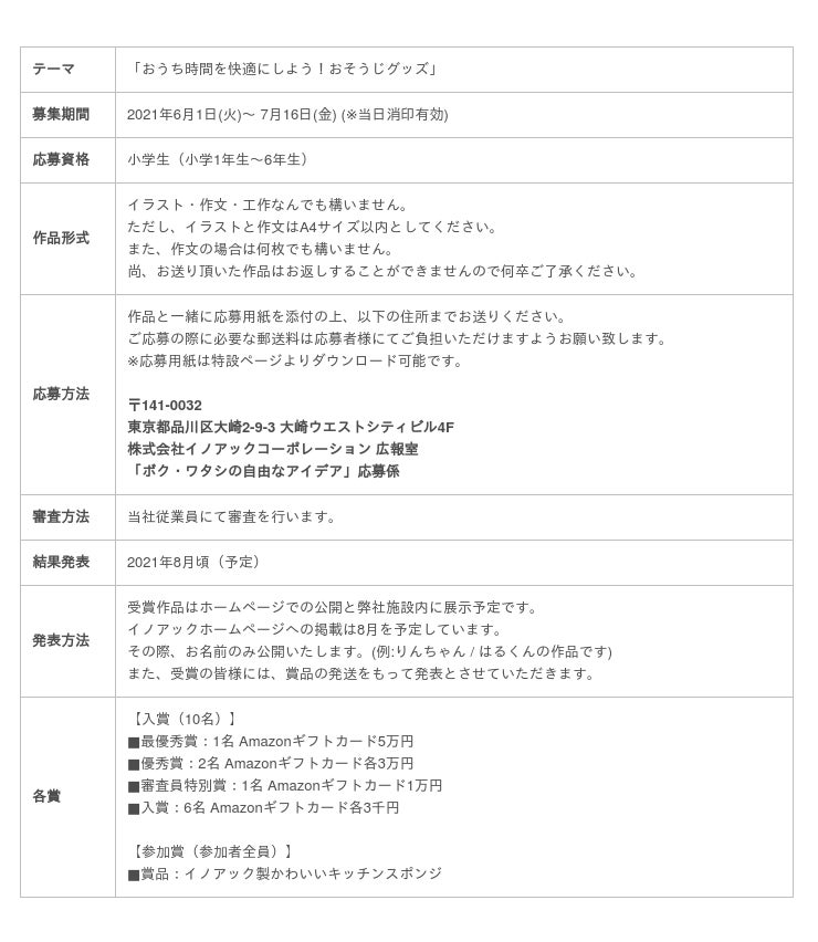 日本で初めてウレタンフォームの生産を始めた高分子素材のリーディングカンパニーである株式会社イノアックコーポレーション(代表取締役:井上聰一、名古屋本社:愛知県名古屋市・東京本社:東京都品川区、以下イノアック)は、小学生を対象とした『ボク・ワタシの自由なアイデアコンテスト』を明日2021年6月1日(火)より開催します。
