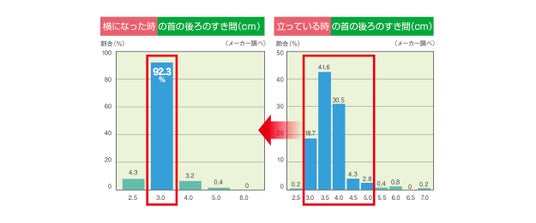 また534名の計測データを研究した結果、立っている時の首の後ろのすき間は、体格によって3~5cmとバラつきがあるにもかかわらず、寝ている時はほとんどの人が高さ3cmに集中する結果になりました。これがディーブレスの「高さ3cm理論」です。