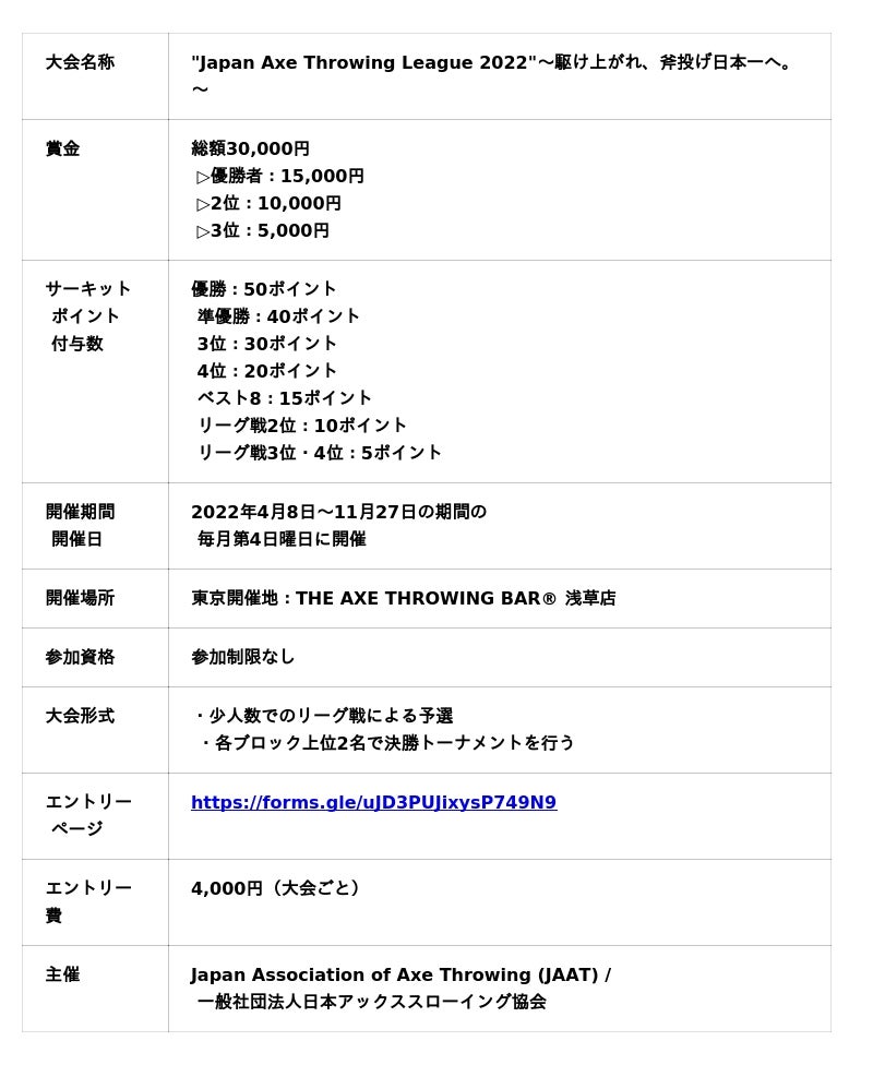 「"Japan Axe Throwing League 2022"~駆け上がれ、斧投げ日本一へ。~(以下、「当大会」)」とは、東京と大阪で毎月第4日曜日に開催される、誰でも参加可能なAXE THROWING(斧投げ)の大会となります。当大会に参加、もしくは上位入賞することで、「斧投げ日本一決定戦。"Japan Axe Throwing Championship 2022 @TOKYO"」への出場権を獲得するために必要なサーキットポイントを貯めることができます。その他にも、参加者限定の特典として協会オリジナル斧とAXE THROWINGの利用料がセットになったお得なパッケージプランの購入や、上位3名までには賞金が与えらます。