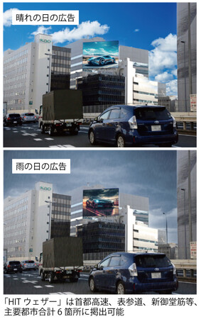 多くの企業は、これまでは広告掲載期間中に1種類の広告だけを掲出してきましたが、「HITウェザー」を利用することで、天気に合わせて複数の広告を出し分けることが可能になります。例えば、自動車メーカーの場合、屋外広告デジタルボートが設置されている場所の天気が晴れならば、快適なドライビング体験を提案する広告を、雨の予報が出たら、近くのショールームに誘導する広告を掲出するといった形で、広告を見ている人がいる場所の天気に合わせて、広告の出し分けができるようになります。