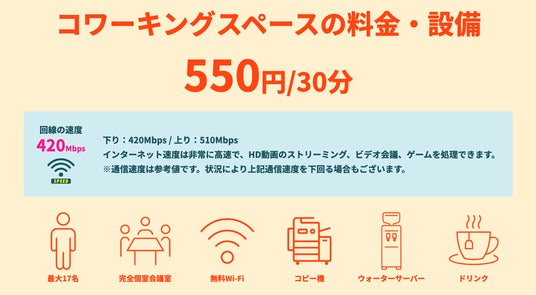 また、店舗内には高速通信が可能な無料Wi-Fiやウォーターサーバー、コピー機、フリードリンクなどの設備も充実。作業やミーティングの間も快適にお過ごしいただけます。