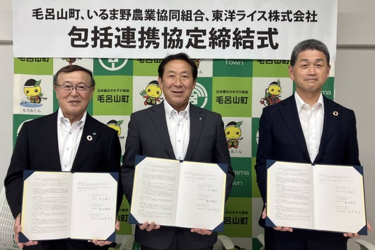 このたび、埼玉県毛呂山町(町長:井上健次、以下「毛呂山町」)、いるま野農業協同組合(本店:埼玉県川越市、代表理事組合長:亀田康好、以下「JAいるま野」)、東洋ライス株式会社(代表取締役社長:雜賀慶二、以下「東洋ライス」)は、農業振興及び町民の健康増進に関する取組などを通じ、「すべての世代がいきいきと健康で幸せに暮らせるまち」づくりに寄与することを目的とした包括連携協定を6月26日に締結いたしました。