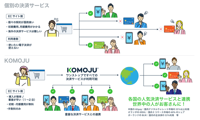 このような越境EC市場の拡大と事業者からの需要を受け、KOMOJUは主に日本国内向けのオンライン決済に加え、海外向けオンライン決済との連携を開始いたしました。