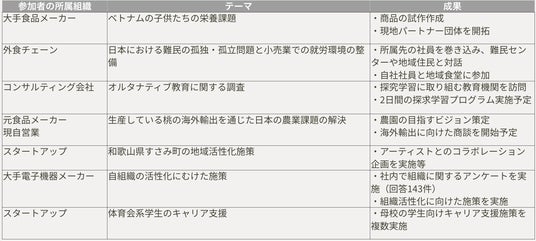 2023年11月~24年5月に実施したSAP第一期には、留職プログラムや社会課題体感フィールドスタディのアラムナイ7名が参加。自身の関心事を探求し、行動へと移していきました。参加者の取り組みテーマは以下の通りです。