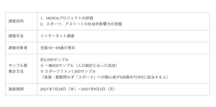 この調査は、アスリートの社会貢献活動の推進により、スポーツでつながる多くの方の関心や行動を生み出し社会課題解決の輪を広げていくことを目的とする日本財団による「HEROs」プロジェクトの効果を把握し、さらなる効果拡大に向けた施策検討を行うとともに、スポーツファンの社会貢献活動に対する意識を一般と比較することで、アスリートやスポーツが与える社会的インパクトを把握するために実施いたしました。