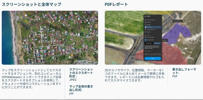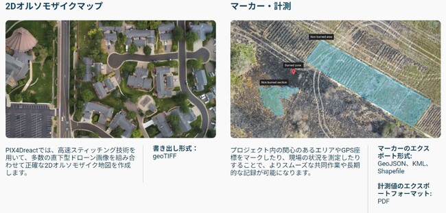PIX4Dreactとは、災害や安全保障などの分野にてドローンで空撮した画像から、迅速に2Dマッピング、長さや面積などの計測、pdfフォーマットでの出力を行うことが出来るPix4D社製のソフトウェアとなります。