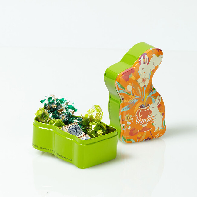 愛らしいウサギ型ギフト缶の中に、ホールのヘーゼルナッツが入ったドゥブルドーネ、ホールのピスタチオが入ったドゥブルドーネ ピスタチオ、イタリア伝統のクレミノの3種類6個をアソート。缶のカラーは2種類。