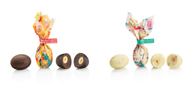イースター気分を盛り上げるエッグ型のホワイトチョコレート。軽く塩味を付けたクランチーな食感のピエモンテ産のヘーゼルナッツ、ピスタチオ、ローストアーモンドなどがぎっしりと混ぜ込まれています。