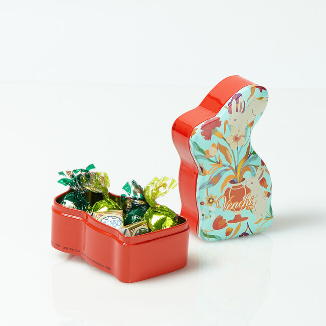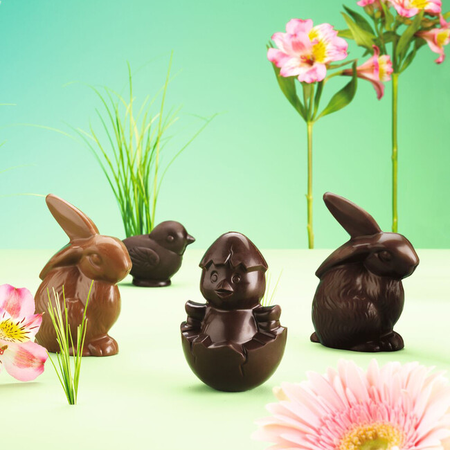 60%のダークチョコレートで作られた愛らしいウサギ型のホロウ・フィギュア※。満開に咲き誇る春の花々に囲まれた、幸せに向かって飛びはねるようなウサギです。