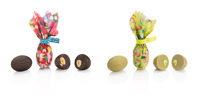 イースター気分を盛り上げるエッグ型のダークチョコレート。軽く塩味を付けたクランチーな食感のピエモンテ産のヘーゼルナッツがぎっしりと混ぜ込まれています。