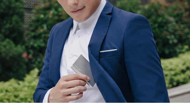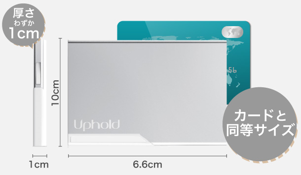 クレジットカードと比較するとそのサイズがお分かりいただけるかと思います。とてもコンパクトで洗練されたデザインは、ビジネスシーンにおいても、また普段の生活においても非常に使い勝手の良いものとなっています。