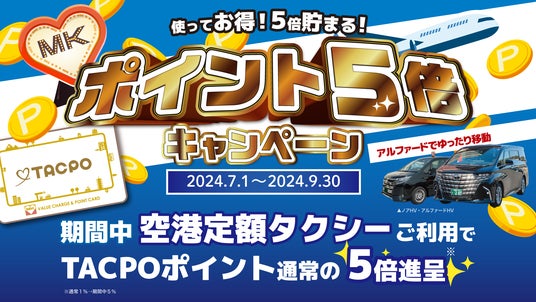 【2024年7月1日(月)00:00~9月30日(月)23:59】期間中の空港定額タクシーご利用で通常の5倍のTACPOポイントを付与!通常1%のところ5%付与でお得♪