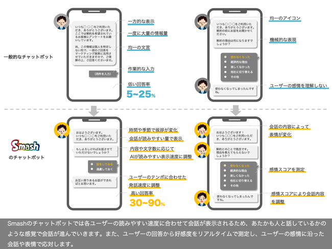 Smashのチャットボットでは、サービスや商品に対する温度感や対話全体を数値化し、リアルタイムで空気を読むことにより、ユーザー毎に会話内容や表示速度を変えたり、時間や季節、感情を反映させたりするなど、デジタルの枠を超えた、より人間との会話に近いコミュニケーションを実現しています。また、導入企業はチャットボット上で蓄積されるコミュニケーションデータをサービス改善やマーケティング施策に活用でき、解約抑止率の向上に繋げることが可能です。