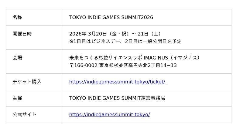 ゲーム業界に特化した動画制作・広告運用サービス「Mr.GAMEHIT(ミスターゲームヒット)」(https://mrgamehit.com/)を提供する株式会社メイラボ(本社:東京都港区、代表取締役:佐藤 真一)は、インディーゲームの祭典『TOKYO INDIE GAMES SUMMIT 2026』に協賛しましたことをお知らせします。また、イベント開催を記念し、特別キャンペーン「【TIGS2026開催記念】ゲームPV制作98,000円祭り」を実施いたします。