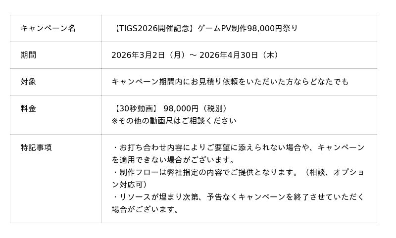 ▼【TIGS2026開催記念】ゲームPV制作98,000円祭りの詳細はこちらのフォームから▼