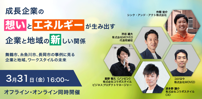 株式会社コラボスタイル(本社:愛知県名古屋市)主催イベントに、株式会社MOVED(本社:東京都大田区)のメンバーが登壇します。新しいかかわりによって生まれる新たな価値やワークスタイルについて考えるイベント。