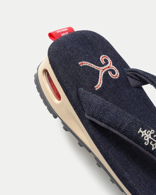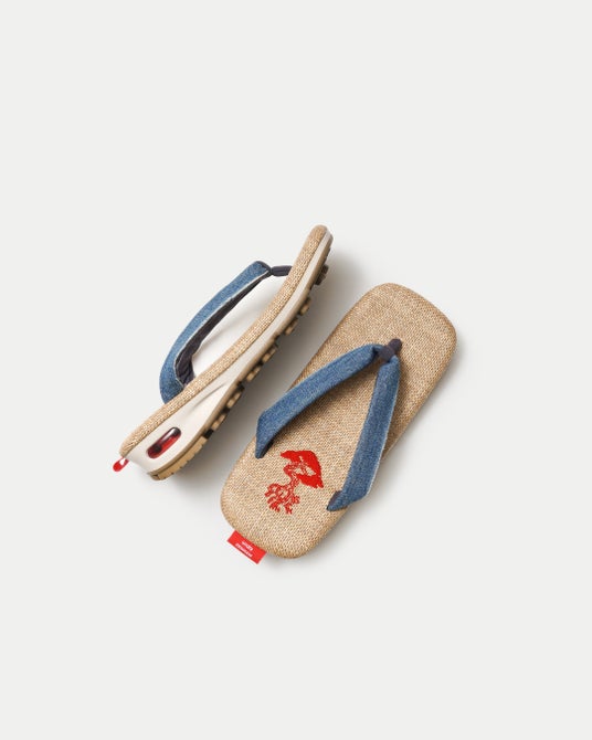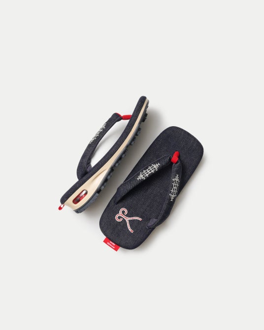 約100年前の着物からインスピレーションして作成したこのモデルは、鼻緒とフットベッドにアイコンである刺繍を施し、刺繍色に合わせてソールも別注カラーに。