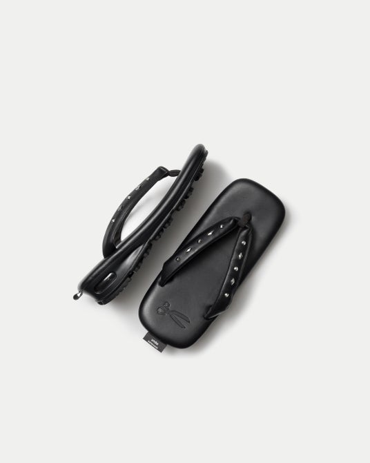 パーからソールまで全体をオールブラックでまとめ、鼻緒のスタッズがコーディ