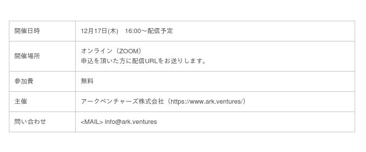 申し込みはこちら:https://www.ark.ventures/webinar/