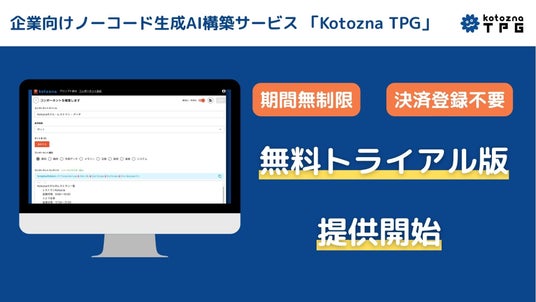 Kotozna株式会社(本社:東京都港区、代表取締役 後藤玄利、以下Kotozna)は、ノーコード型の生成AIチャットボットプラットフォーム「Kotozna TPG(Tailored Prompts Generator)」の無制限無料トライアル版を2025年7月8日(火)より提供開始いたします。これにより、期間制限や決済方法の登録なしで、誰でも自分のペースで「Kotozna TPG」の機能をテスト・体験いただけます(非商用利用に限る)。Kotoznaは、「誰もが高性能な生成AIチャットボットを構築できる世界」の実現に向け引き続き、利便性の高いサービスを追求してまいります。
