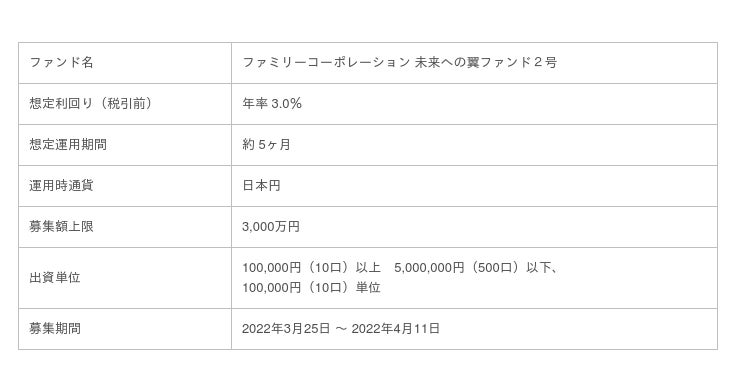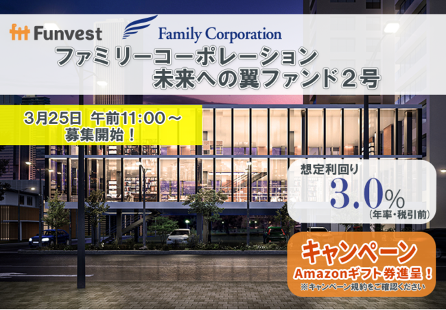 「未来をわかちあう投資」を提供する「Funvest(ファンベスト)」(以下、Funvest)は、「ファミリーコーポレーション 未来への翼ファンド2号」(以下、本ファンド)の募集を3/25より開始しますので、お知らせいたします。