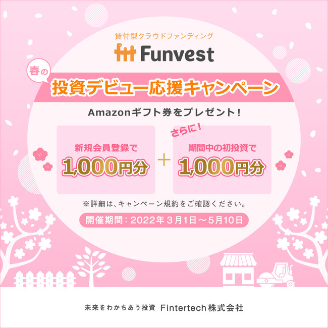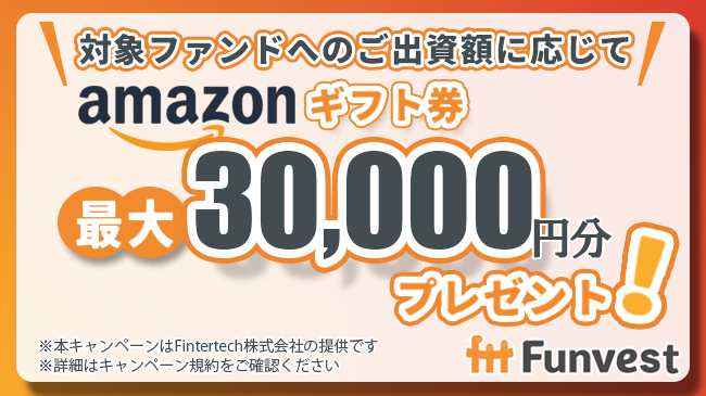 また、本ファンドに出資していただいた投資家の皆様を対象として、出資額に応じて最大30,000円分のAmazonギフト券をプレゼントするキャンペーンも併せて実施いたします。
