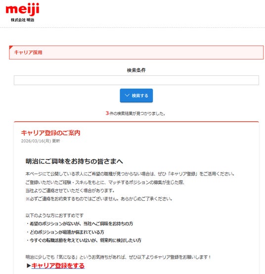 明治のキャリア採用ページ内にあるキャリア登録の案内