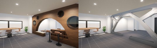 ▲(設計例)そのまま使用するとデザイン性が損なわれる鉄骨耐震ブレース。部屋を区切ることなく通り抜けできるタイプを選び、耐震補強土台にベンチや棚を造作することで、建物の機能を妨げることなく高耐震化に成功。