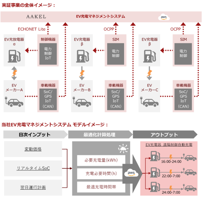 遺伝的アルゴリズムを活用したEV充電マネジメントシステムと、技術的難易度が高いとされる複数社メーカーの異なる「EV車両・EV充電器・通信制御プロトコル」を組み合わせた遠隔制御自動充電を同時に運用し、系統の制約やEV充電状態に応じたEV充電量をコントロール