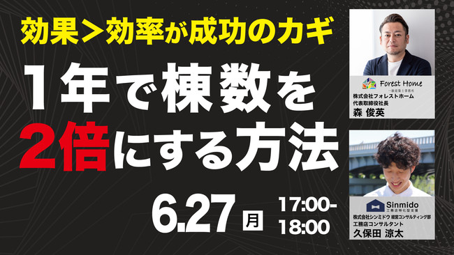 株式会社シンミドウ(本社:埼玉県さいたま市、代表取締役:笹田知弘)と株式会社フォレストホーム(本社:千葉県木更津市、代表取締役:森俊英)は、2022年6月27日(月)に、全国の工務店・建築事務所を対象に、【FCに頼らずに棟数を伸ばし続ける工務店の共通点とは?】1年で棟数を2倍にする方法無料ウェビナーを開催します。