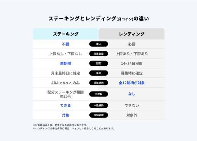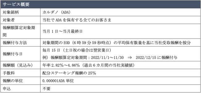今回サービス対象となる銘柄はカルダノ(ADA)となりますが、ステーキング対象の銘柄については今後順次拡大させていく予定です。