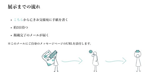 投稿は匿名で無料。ニックネームとメールアドレスを入力すれば、誰でも気軽に参加できます。手紙は運営による審査を経て、公開されます。投稿者の情報は〈父の享年〉〈死別当時の年齢〉〈手紙本文〉のみが掲載され、年齢等自分に近い境遇の方がどのように父との死別と付き合っているか、特設サイトから垣間見れるような設計をしています。