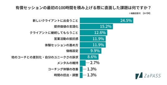 - 有償セッション100時間の達成における課題は、「新しいクライアントに出会うこと」が最多。