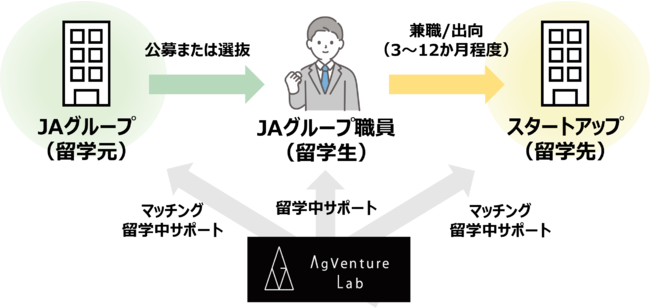 当社はオープンイノベーションプログラム「JAアクセラレーター」を通じて得たスタートアップの組織文化や経営戦略に対する知見、スタートアップを伴走支援するJAグループ職員へのサポート実績、JAグループに対する深い理解を活かし、留学生とスタートアップの適切なマッチングを実現するとともに、留学中もスタートアップ、JAグループ、留学生それぞれへの手厚いサポートを提供します。
