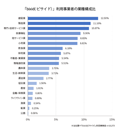bixid(ビサイド)内で最も多く利用されている業種第1位は『建設業』の12.50%という結果になりました。